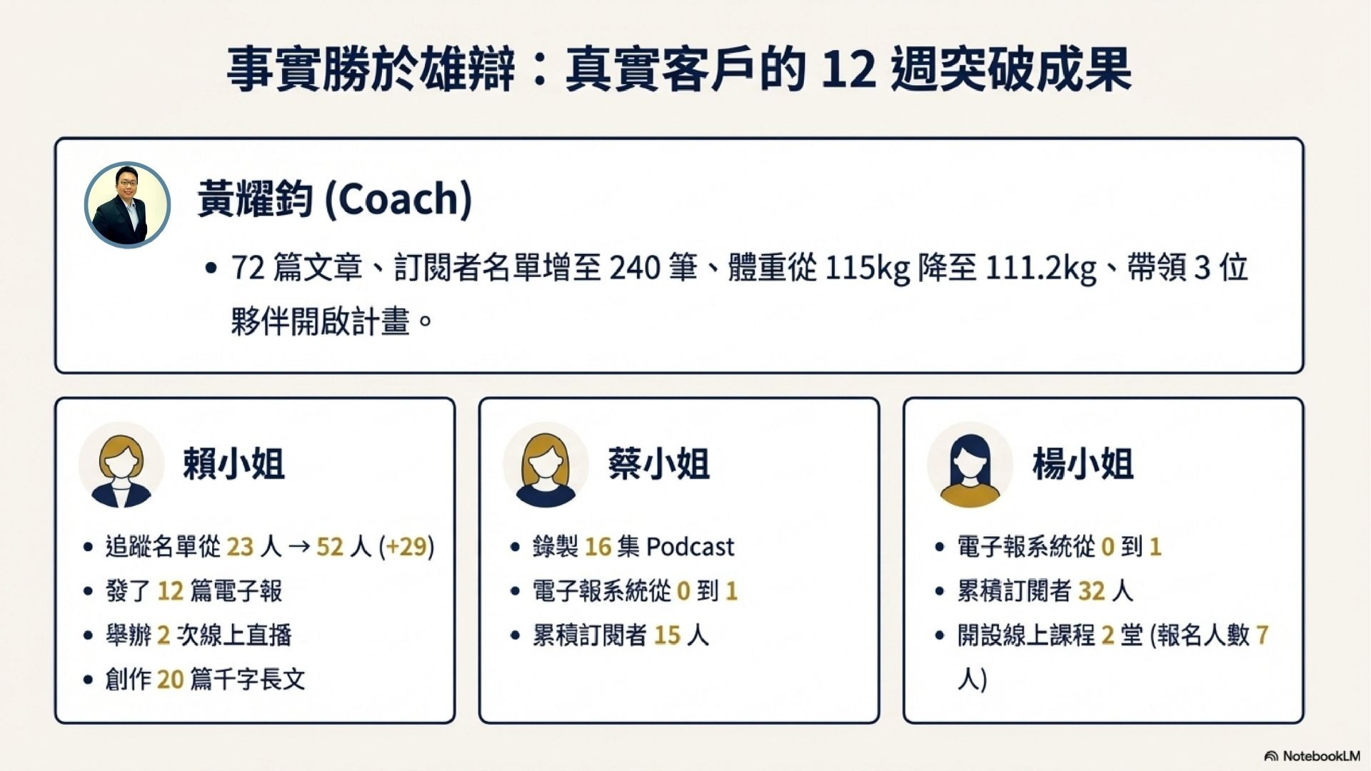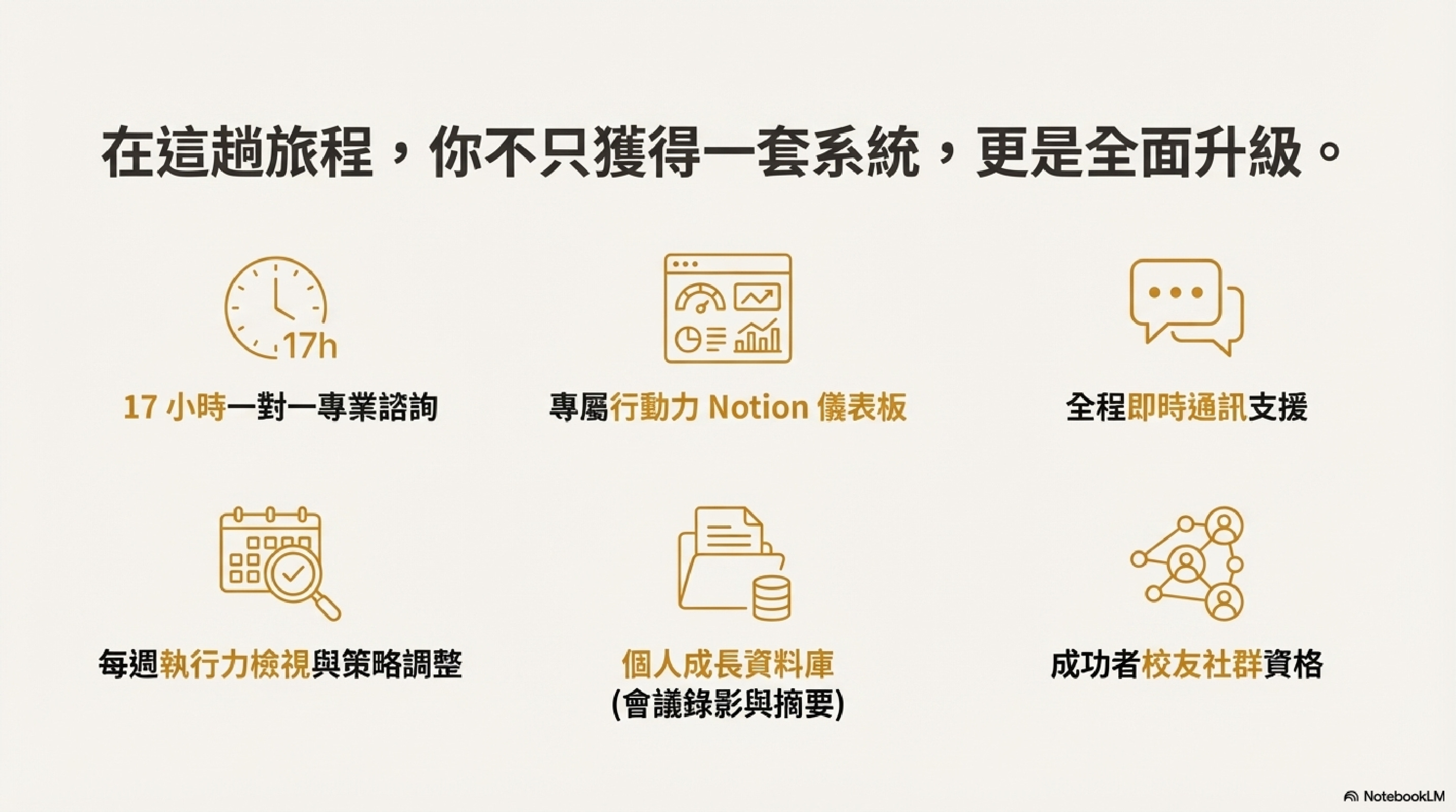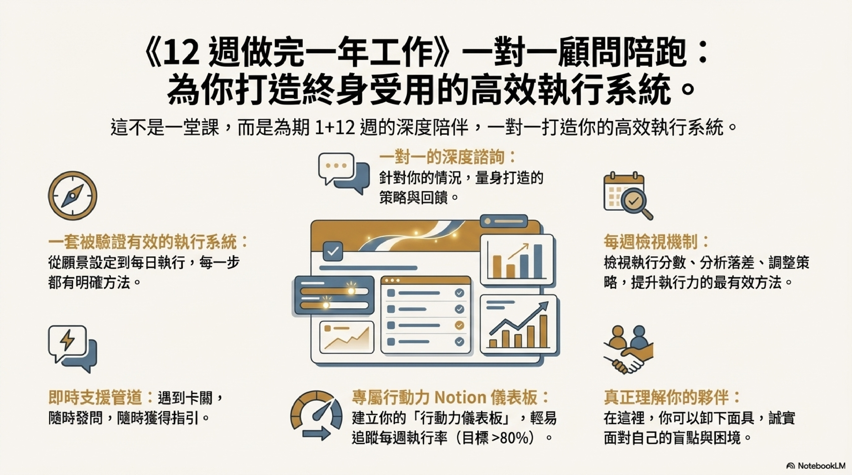 我把《12 週做完一年工作》一書中的系統,變成 13 週的一對一顧問陪跑,配上每週的會議指導、數據的即時追蹤,讓你不只「知道」如何做,更「做到」你夢寐以求的目標。