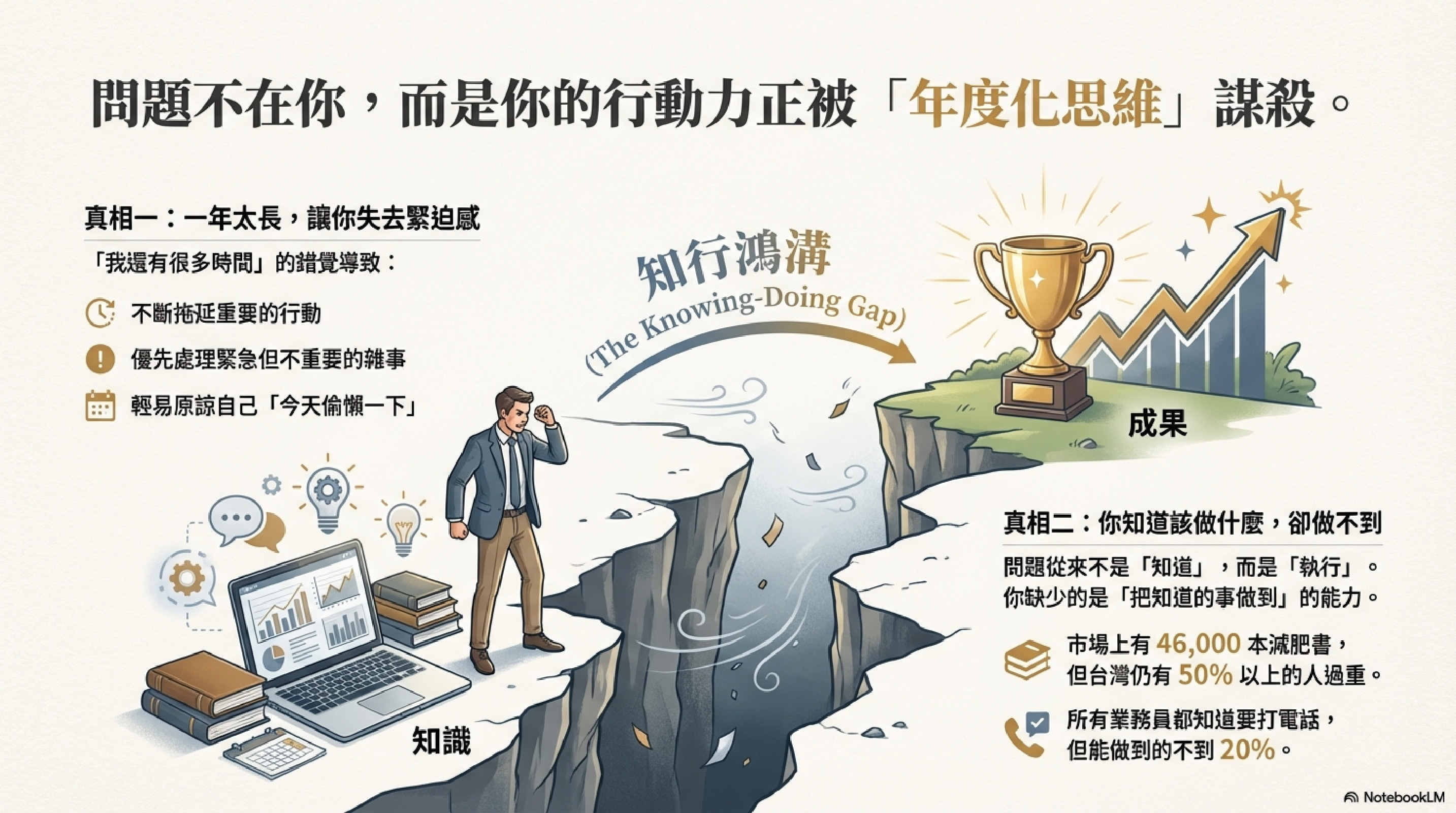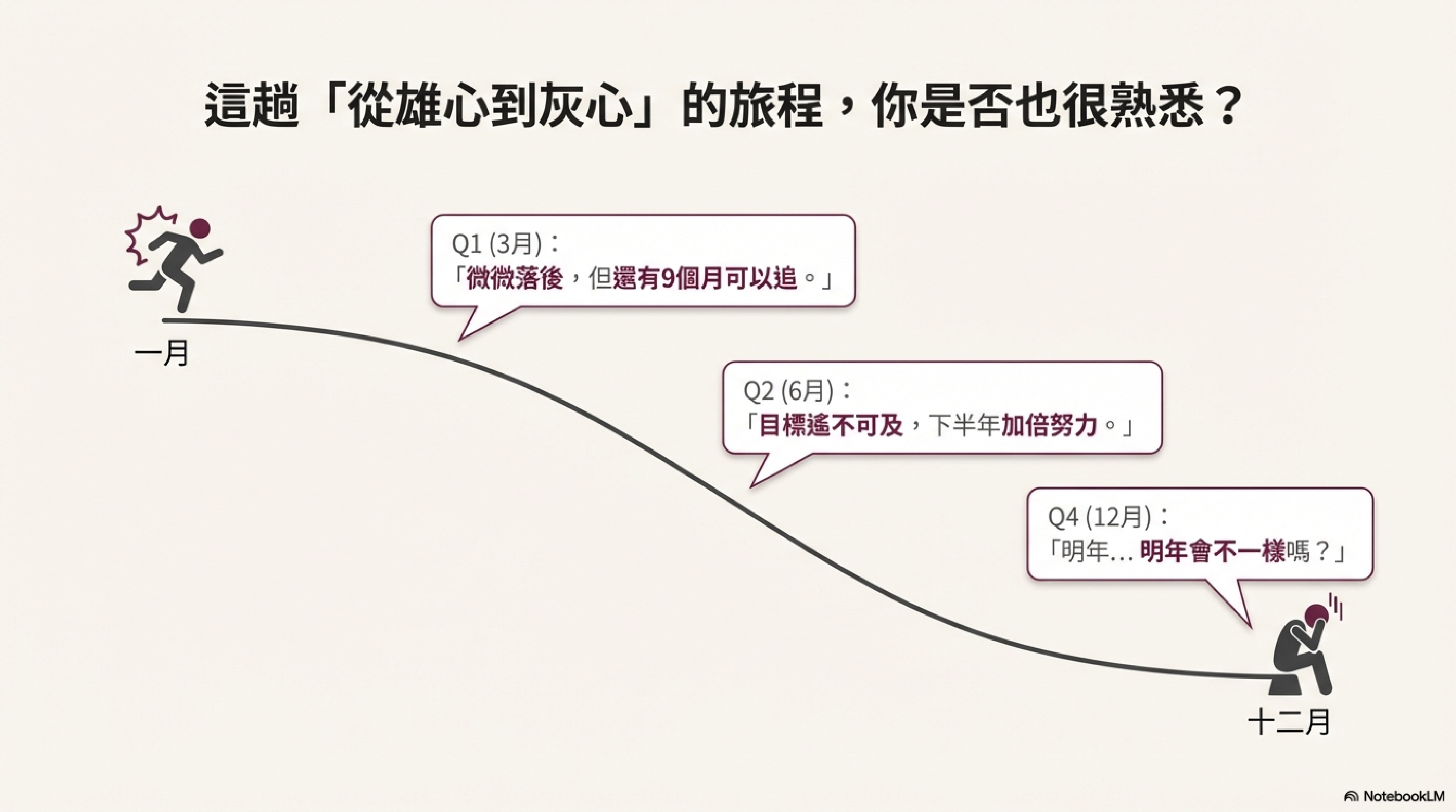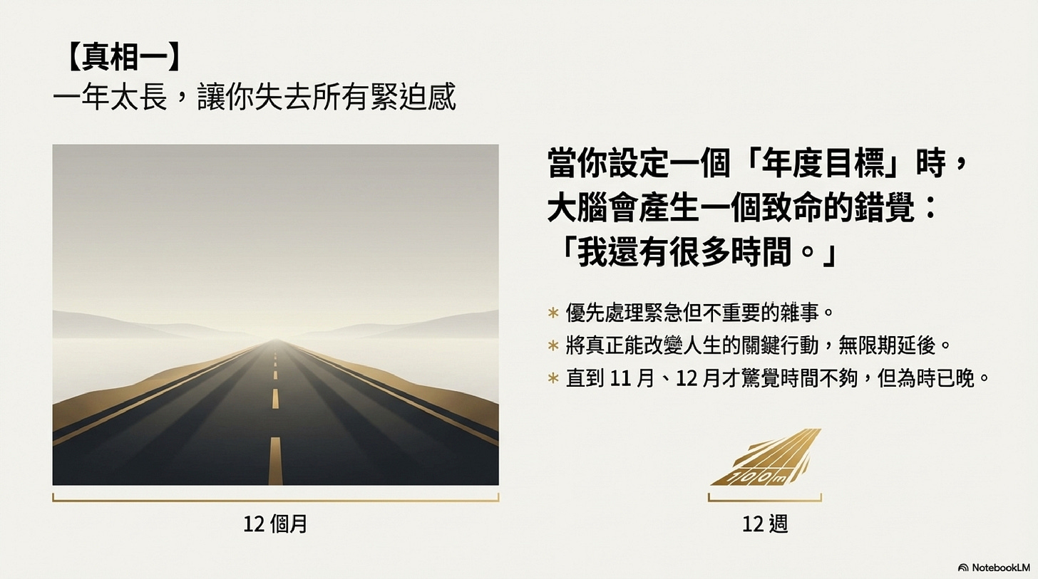 當你設定一個「年度目標」時,大腦會產生一個致命的錯覺,那就是:「我還有很多時間。」