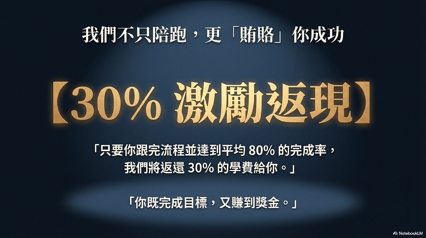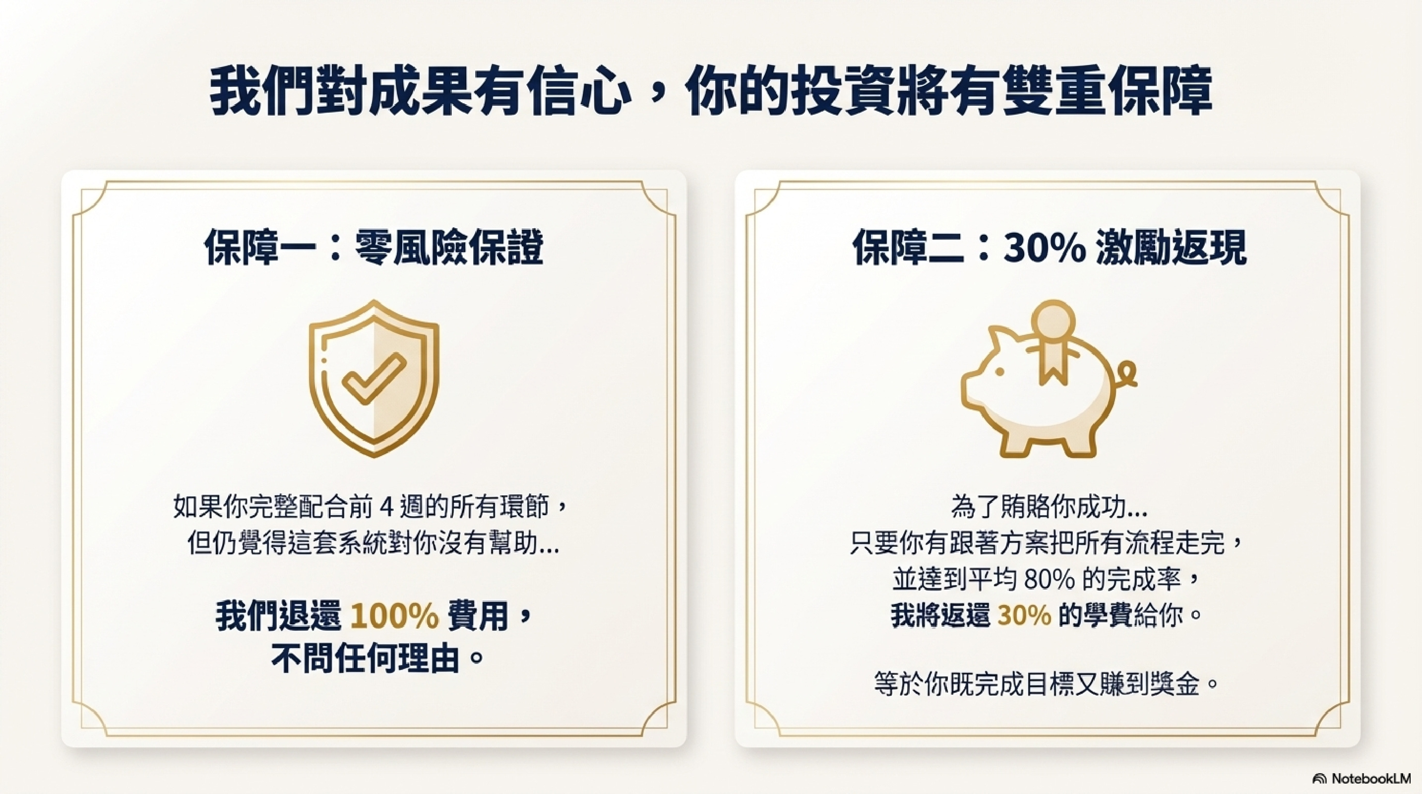 不管你是選擇【基礎方案】、【進階方案】還是【頂級 VIP 方案】,只要你有跟著方案把所有流程走完,並達到平均 80% 的完成率,我將返還 30% 的學費給你,等於你既完成目標又賺到獎金呀。😁