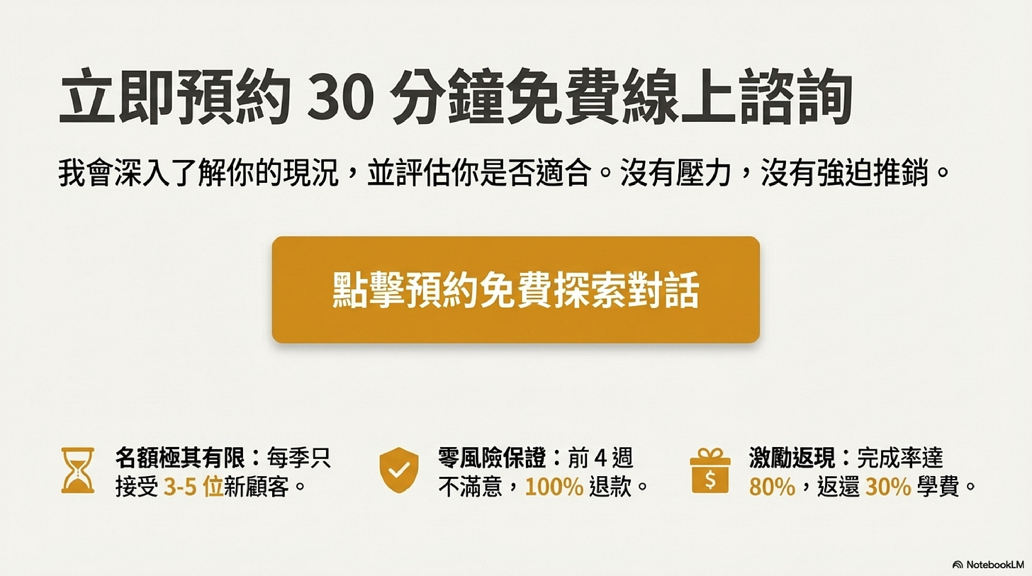 第一步很簡單:先跟我預約 30 分鐘免費線上諮詢。