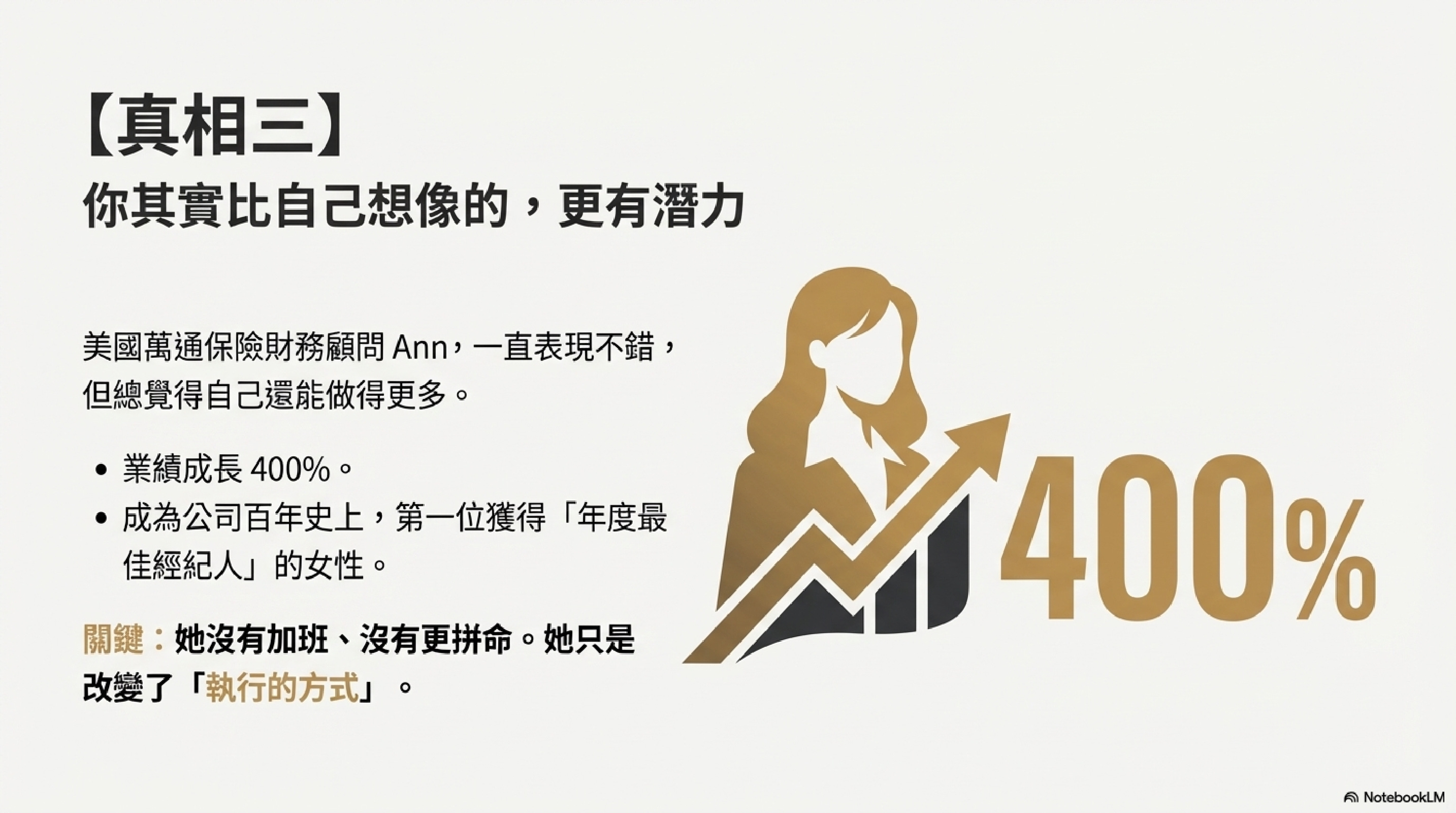 更驚人的是 —— 她沒有加班、沒有更拼命、沒有找更有錢的客戶。