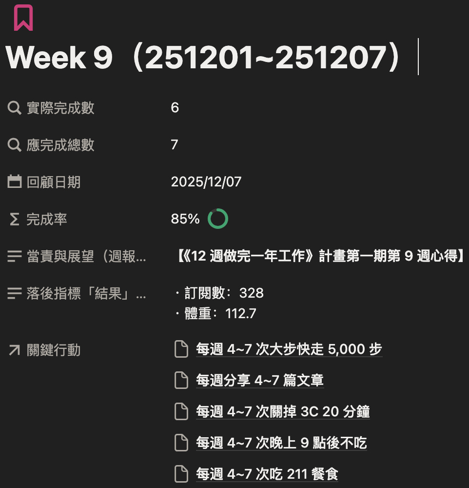 今天想與你分享,我《12 週做完一年工作》計畫第一期第 9 週心得(251201~251207)。