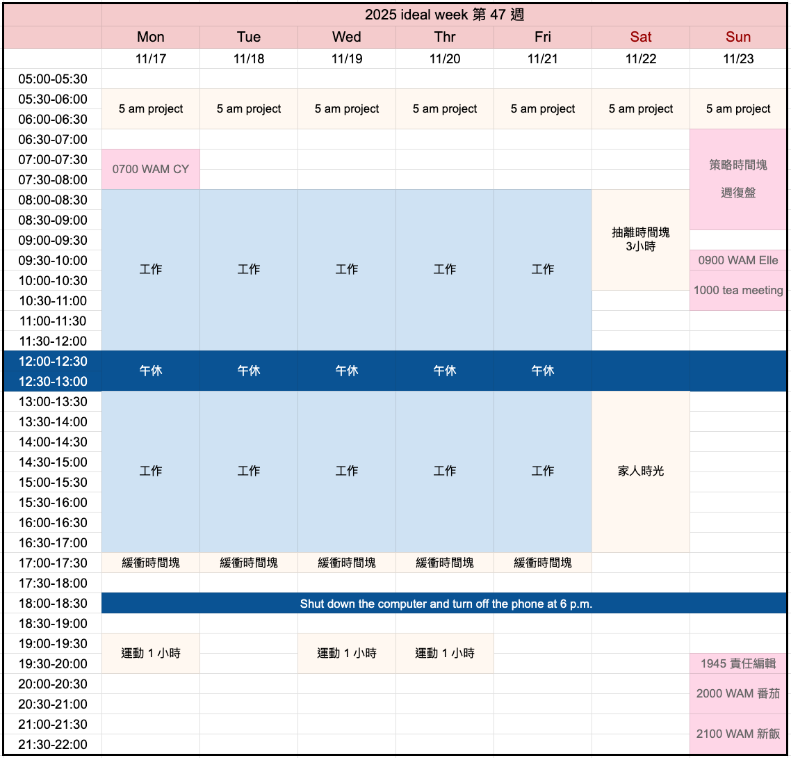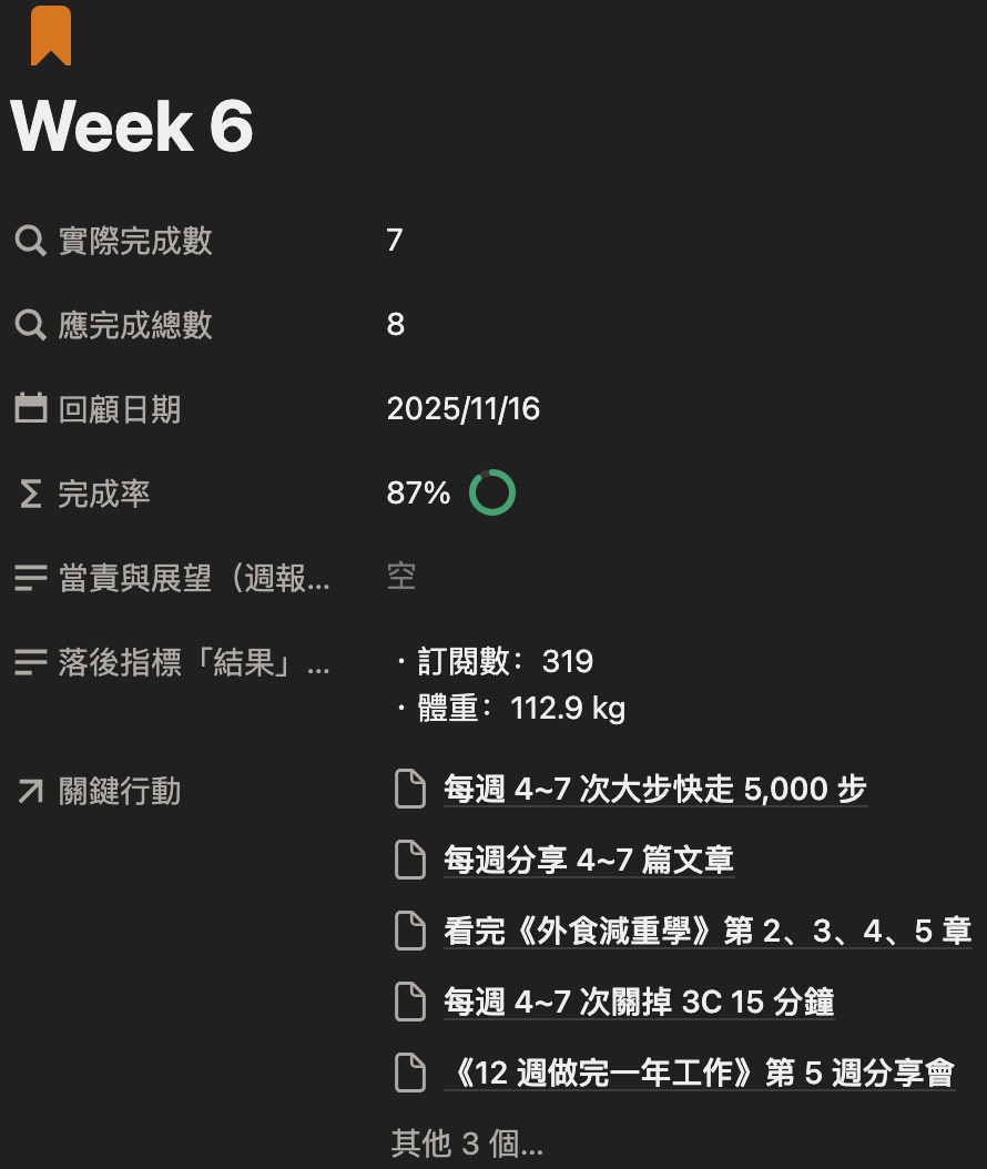 今天想與你分享,我《12 週做完一年工作計畫》第一期第六週心得(251110~251116)。